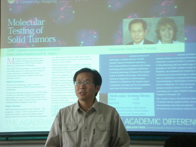 张胜乐博士从分子生物学在诊断中的运用入手,着重介绍了PCR技术和FISH技术在肉瘤诊断与治疗中的运用。张博士的精彩讲述和全英文的前沿资料大大开拓了同学们的眼界。历时两个多小时的讲座在同学们雷鸣般的掌声中结束。
