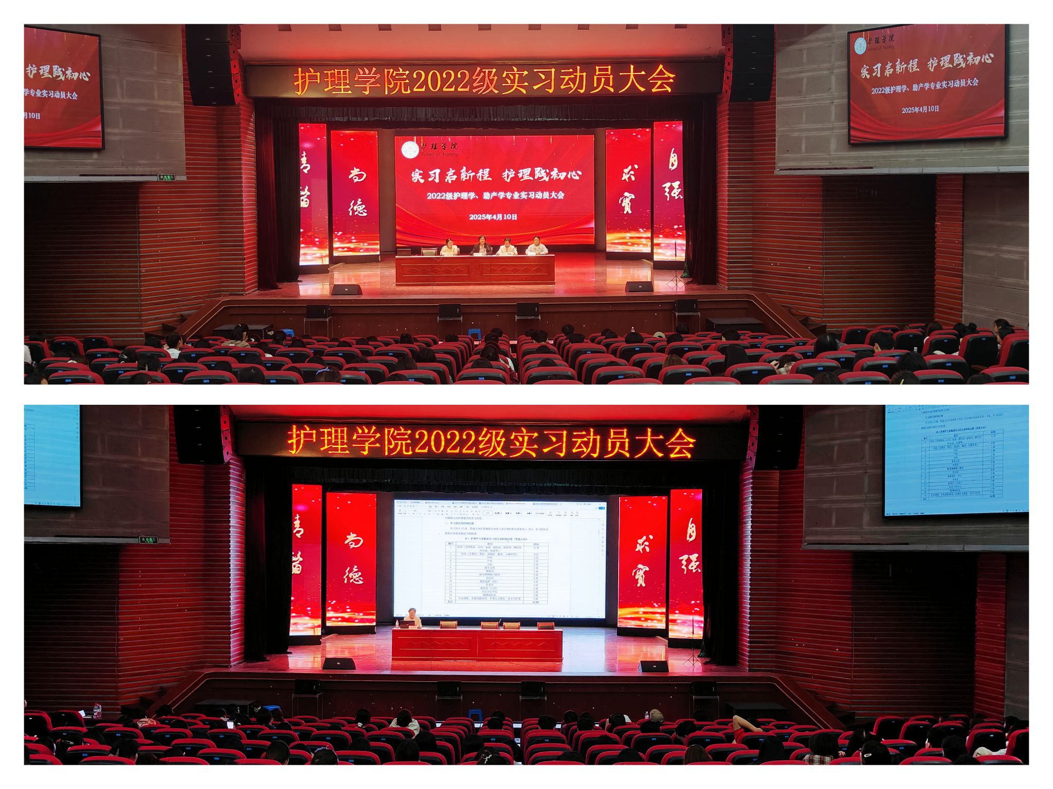 精准指导,广泛动员。为扎实做好学生实习工作,4月11日,护理学院在滨江校区大学生活动中心大礼堂召开实习动员大会,护理学院院长李远珍、副院长崔慧霞、年级辅导员及2022级全体学生参加会议。会上,李远珍强调了实践教学的重要性,围绕职业防护、安全教育、工作纪律等方面对同学们提出具体要求,勉励大家珍惜学习机会,端正学习态度,遵守规章制度,在实习岗位上砥砺素质、提升能力,为学院和学校增光添彩。崔慧霞详细解读了实习大纲中的科室轮转要求、实习管理制度、实习请假制度等,希望同学们转换角色快速适应,端正态度踏实学习,坚守初心笃志前行,以扎实的临床技能和温暖的人文关怀,答好这份关乎生命的青春考卷。年级辅导员强调了实习安全注意事项,提醒同学们尽快适应新环境,遵守实习单位规章制度,提前做好职业规划,树立正确的择业观和就业观,以饱满的精神状态投入新的学习阶段。