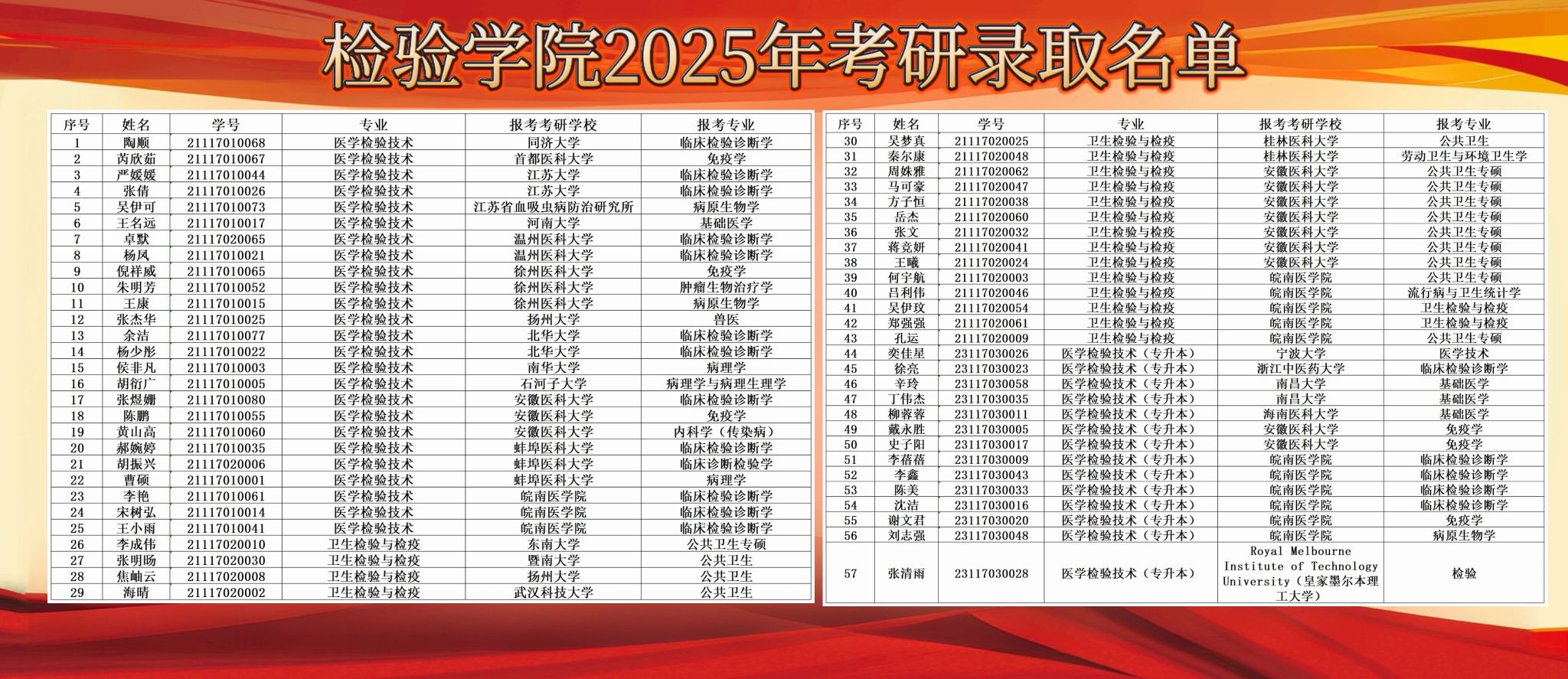 随着4月30日考研调剂系统的关闭,2025年研究生复试工作全面结束。检验学院2025届186名毕业生中,共考研拟录取57人,包括境内升学56人、境外留学1人,升学率达30.65%,再创升学率新纪录。其中,2021级医学检验技术专业升学率为31.65%、2021级卫生检验与检疫专业升学率为38.30%、2023级医学检验技术(专升本)专业升学率为23.33%,均为历史升学率最高纪录。