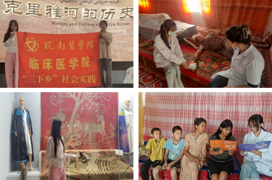 专项团队助力,籽籽同心拼图。在文化传播与民族团结方面,“微尘”志愿服务队成功入选“石榴行祖国行”专项社会实践团队。志愿者们带领当地学生参观于田县博物馆等红色遗迹,通过实物展览、历史讲解,引导学生感悟先辈奋斗精神;队员迪丽娜孜结合自身成长经历开展红色宣讲,增进各民族学生的认同感与凝聚力。在于田、和田两地,通过民族歌舞表演、传统手工艺品展示等形式,展现多元民族文化魅力;同时组建“三下乡”健康服务队走进乡村,普及卫生健康知识,为当地居民健康保驾护航。