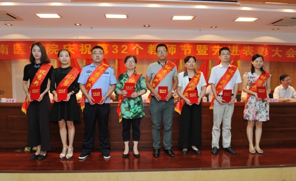 热血丹心育桃李,薪火相传写春秋。在全国第32个教师节之际,我校于9月9日在学术报告厅召开庆祝第32个教师节暨先进表彰大会,对2014/2015、2015/2016两个学年学校优秀共产党员、优秀党务工作者、先进党支部和优秀教师、优秀教育工作者、优秀辅导员、先进集体进行表彰。校领导王先俊、章尧、李刚、刘人人、廖圣宝、吴金月,处级干部,受表彰的先进集体和优秀个人,30年教龄教育工作者,师生代表以及临床(护理)学院代表近300人参加大会。大会由党委副书记、院长章尧主持。