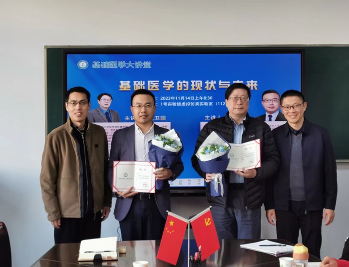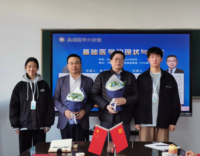 活动最后,学院党委书记、副院长马旭明,党委副书记、院长李曙分别向两位老师颁发了“基础医学本科生导师”聘书;学生代表向两位老师送上鲜花,并合影留念。