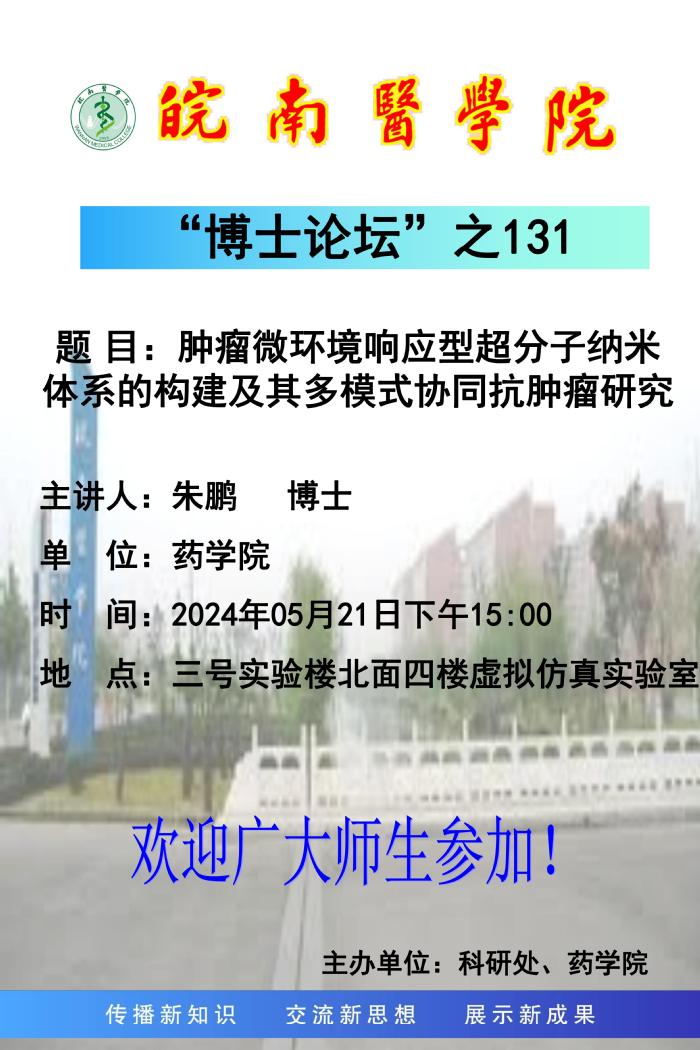 博士论坛之131:肿瘤微环境响应型超分子纳米体系的构建及其多模式协同抗肿瘤研究